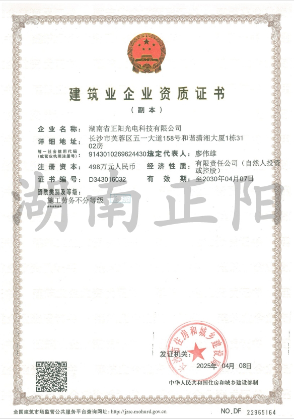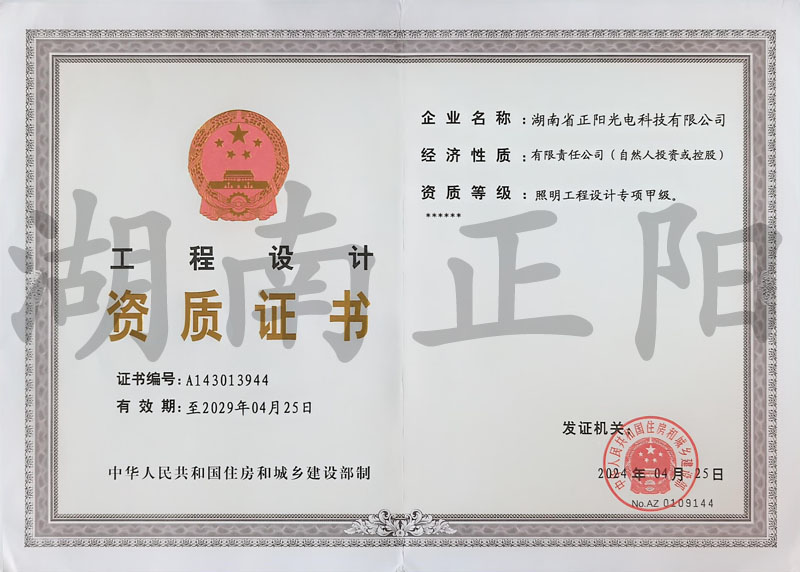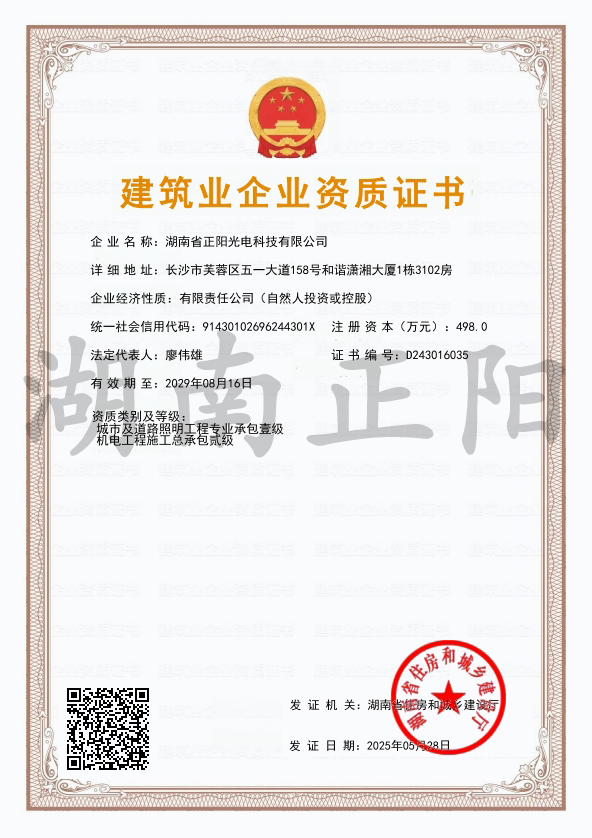 湖南省正陽(yáng)光電科技有限公司是一家從事亮化工程及大型燈光藝術(shù)的設(shè)計(jì)、制作、安裝和維護(hù)于一體的專業(yè)化公司。公司資質(zhì)齊全、管理嚴(yán)謹(jǐn)、技術(shù)先進(jìn)、實(shí)力雄厚,取得了城市及道路照明工程專業(yè)承包壹級(jí)資質(zhì)、照明工程設(shè)計(jì)專項(xiàng)甲級(jí)資質(zhì)、機(jī)電工程施工總承包貳級(jí)資質(zhì)、施工勞務(wù)等資質(zhì),榮獲“重質(zhì)量·守誠(chéng)信”示范企業(yè)。